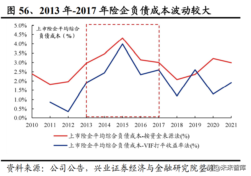 负债端费率改革加剧投资端竞争,负债成本高企之下,以资产驱动负债的管理模 式风险暴露,险资权益投资经大起大落。2013 年我国人身险费率市场化改革开始, 普通人身险保单法定评估利率上限放宽至 3.5%,普通型养老年金或 10 年期及以 上的普通年金则放宽至 4.025%。2015 年,万能险费改也全面启动,取消了最低保 证利率不超过 2.5%的限制,将自主决策权交还给保险公司。(报告来源:未来智库)