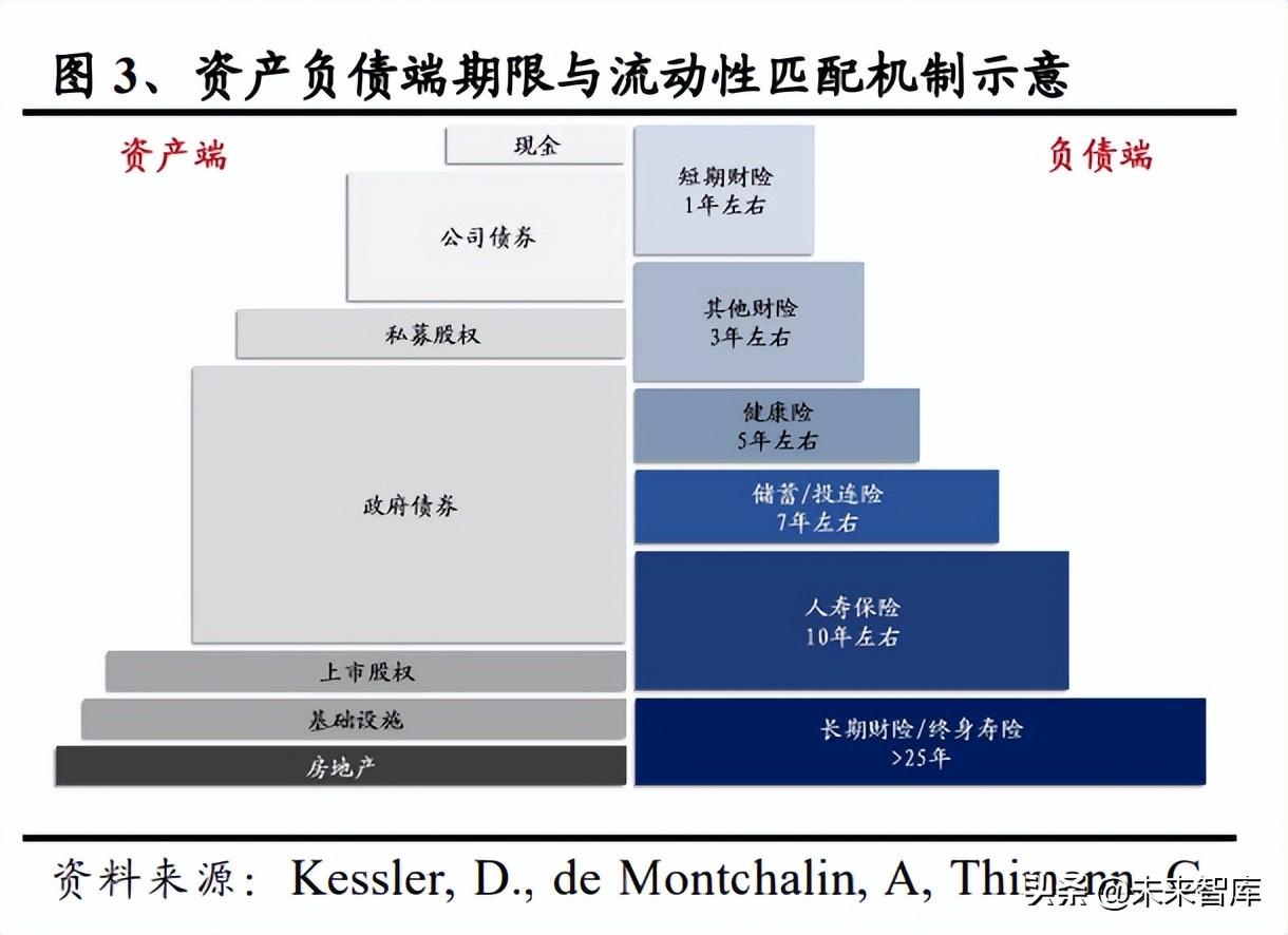 综上所述,为应对利率下行周期,各国家地区保险资产配置由于自身禀赋状况不 同而有所差异,总结来看: 资产端:期限匹配与收益匹配是关键 固收类资产配置可以从期限和信用两方面出发进行调整。期限方面,多数境外国 家均在利率下行初期增配长久期债券以锁定相对更高的收益率;信用方面,欧美 国家寿险行业考虑通过适当下调债券信用评级,在风险可控情况下改善投资收益 率。相比美国等直接融资体系发达,资本市场工具供给充足的市场,诸如中国台 湾地区或是日本等体量较小,险资可投资资产供给存在不足的市场,又或是如英 国等保险资产体量巨大,国内资本市场已难以全部吸纳的市场,则考虑以扩大海 外投资的方式寻求超额收益,并优化期限结构。