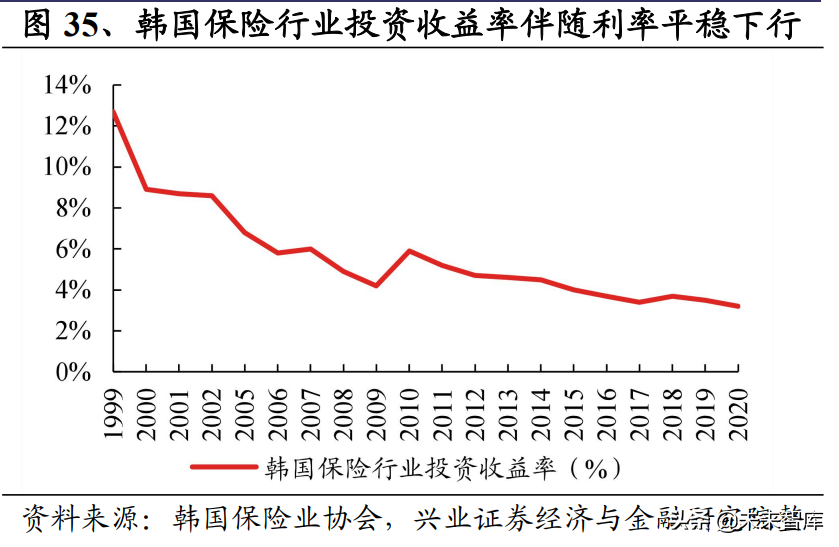 韩国较晚步入低利率周期,寿险投资收益率伴随下降,但相对平稳。1998 年亚洲 金融危机爆发使得韩国利率汇率急速上升,公司债利率上升至 15.1%4,次年起又 进入急降期,利率大幅波动。2000 年后韩国 10 年期国债收益率从 8%的高位逐步 下降,但 2012 年以前仍旧保持在 5%附近的高位,直到 2012 年由于欧债危机等持 续冲击,叠加全球经济放缓导致韩国外向型经济受到冲击,韩国 10 年期国债收 益率首次跌破 3%,而后波动下降至 2020 年 1.5%左右的水平,2021 年以来又呈 现阶段性回升,目前重回 3%以上水平。同时期保险行业收益率显示在 5-8%左右 的水平,后跟随利率下滑持续下降,但相对平稳,2020 年为 3.2%左右。