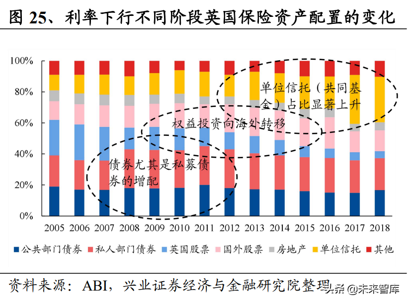 高度自制的监管环境下英国寿险行业资产配置策略根据利率水平进行了幅度较 大的结构性调整。作为保险发展历史最为悠久的国家之一,英国的投资端监管模 式不同于主流国家的大类资产比例限制方式,在满足偿付能力要求的基础上,保 险公司对投资项目、投资范围可进行自主决策。在利率水平保持 5%以上水平的时 期(2000 年之前),英国保险资产配置中权益类资产占比较高,除宽松监管制度 给予保险公司较大自主权之外,另一方面是因为英国寿险行业长期拥有以投资连 结险为主的产品结构,投连险作为英国最主流险种之一,占其人身险市场份额半 数以上。而自利率下行周期开启,英国寿险行业便迅速靠增配固收类资产来稳定 投资收益率,债券投资占比从 2005 年的 39%上升至 2011 年的 45%,且此后稳定 维持在 40%附近,且从债券种类上来看,收益水平较高的私募债增配趋势更为明 显。