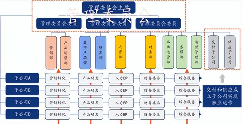 在总部设立执委会,管理整个企业,执委会委员分别管理不同的部门中心;在总部中心部门只负责管理,将具体实施人员分别划转到子公司中,子公司承担起成本,总部管理,并在子公司委派财务人员,设置HRBP。与此同时,成立交付和供应子公司独立运作。