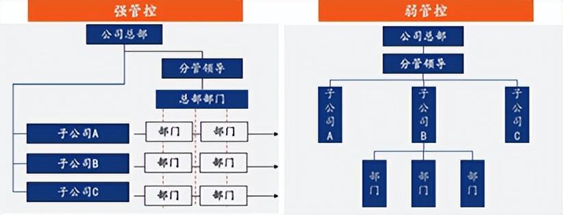 基于此,我们从企业痛点出发,以强管控的方式打造企业总部,强管控是人员在子公司并承担其成本,但通过总部的部门进行直接管理;与之相对应的弱管控是总部通过子公司进行人员管理。