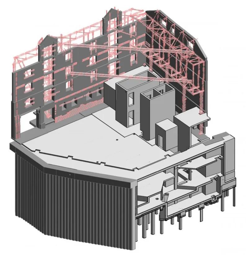 建筑高度由地下两层和地上六层组成,上部结构由结构钢框架组成以提供大跨度区域,整体结构稳定性由钢筋混凝土墙与复合金属面板共同提供。