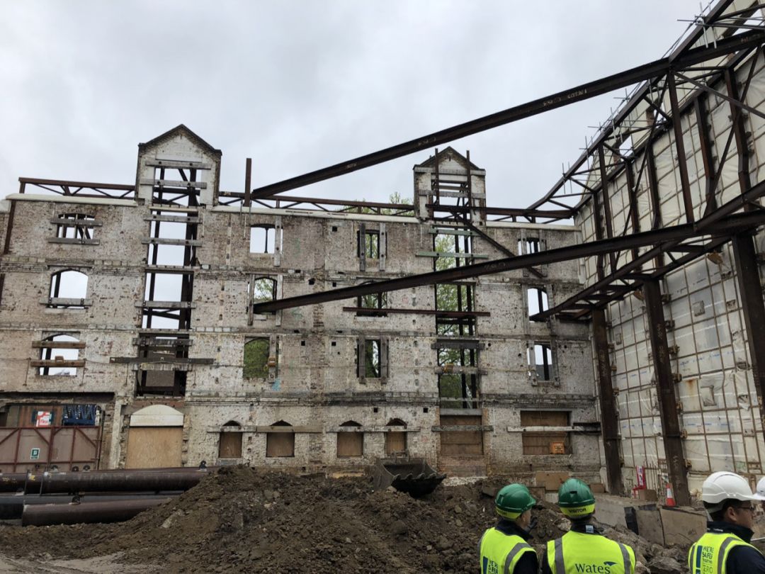 办公室大楼保留了几面年代久远的仓库外墙,并使用辅助钢架来支撑砖石外层,再将其合并至 TOG 的新办公集团大楼。