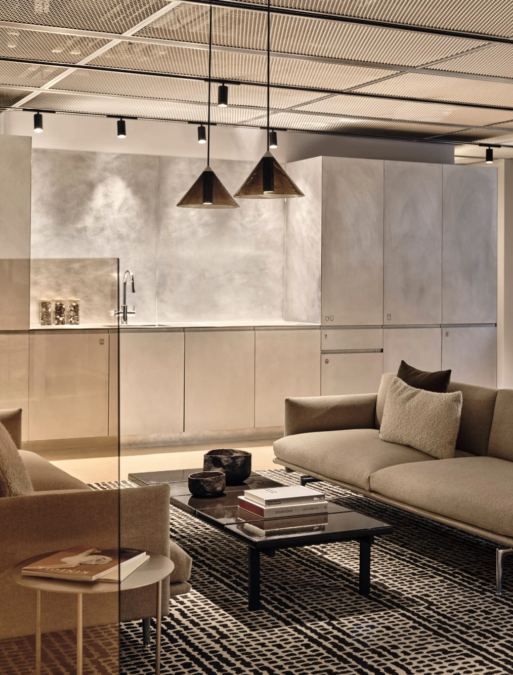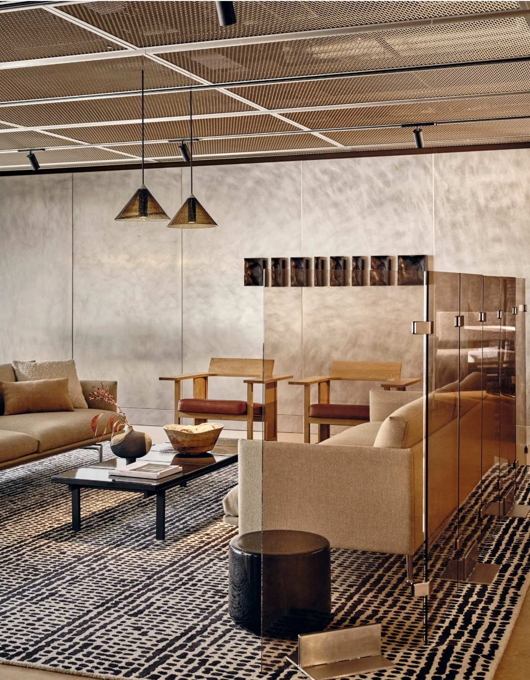 休闲区的沙发背后以清透的茶色玻璃作为软分隔,地面铺设质感满满的块状印花地毯,细节处处显露精致格调。