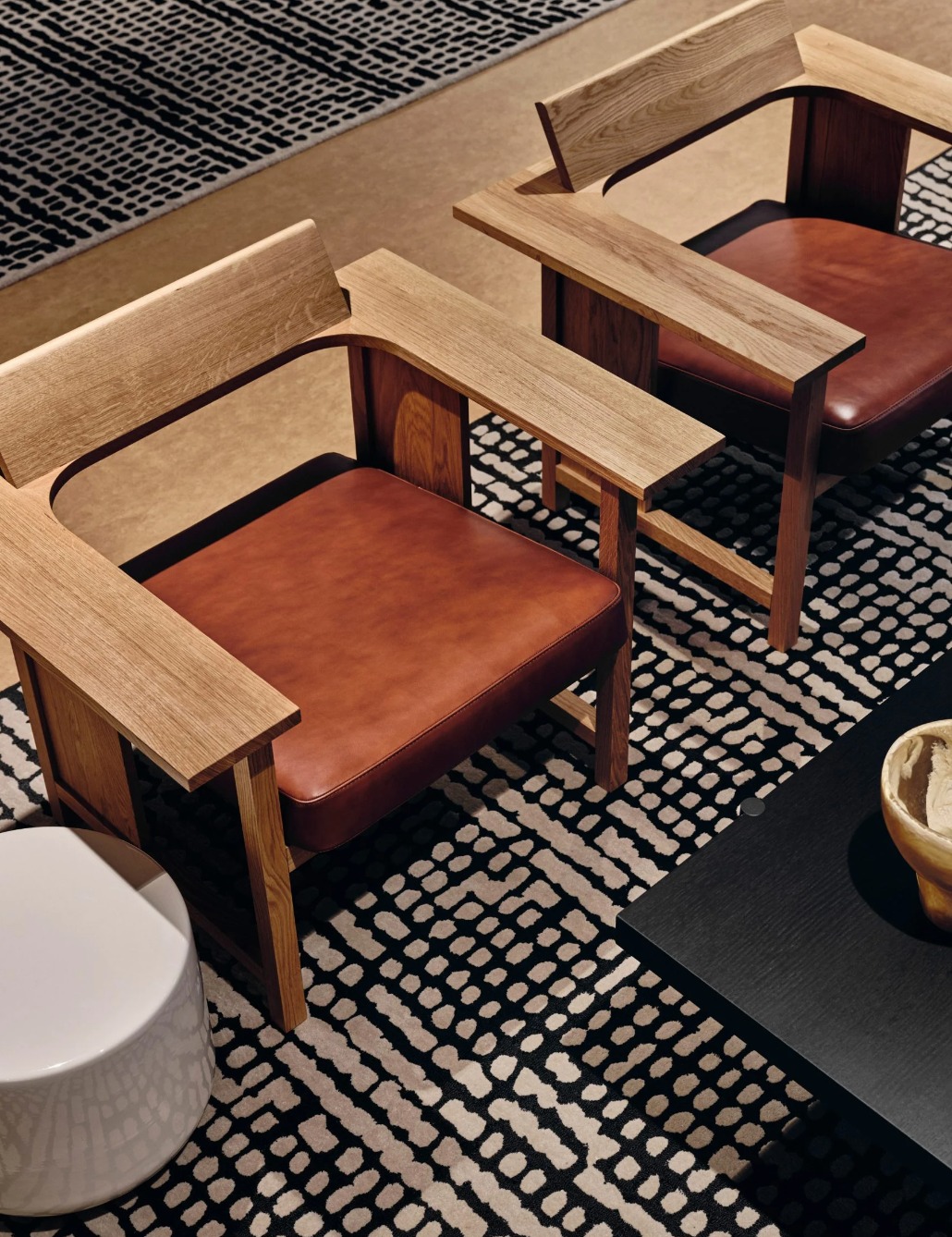 Thulstrup 为深色系空间设计了几款定制家具和照明设施,与高品质的丹麦纺织品品牌 Kvadrat 相结合。