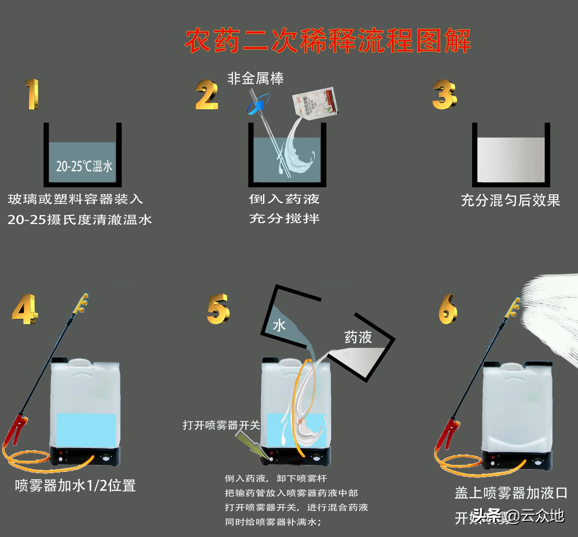 农药二次稀释的方法:先用少量水或稀释载体将农药制剂稀释成母液或母粉,然后再稀释到所需浓度。具体操作如下图所示: