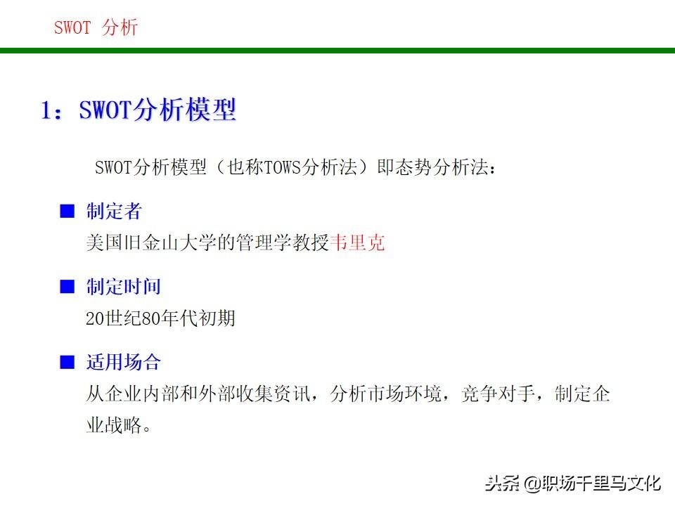 版权声明:我们致力于保护作者版权,注重分享,被刊用文章【swot分析案例范文ppt(超全的SWOT分析法培训课件)】因无法核实真实出处,未能及时与作者取得联系,或有版权异议的,请联系管理员,我们会立即处理! 部分文章是来自自研大数据AI进行生成,内容摘自(百度百科,百度知道,头条百科,中国民法典,刑法,牛津词典,新华词典,汉语词典,国家院校,科普平台)等数据,内容仅供学习参考,不准确地方联系删除处理!;