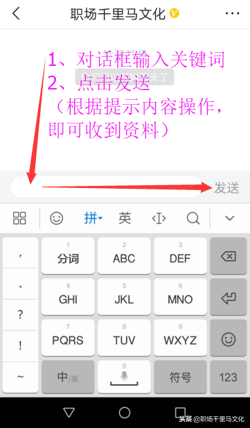 第三步:对话框内输入关键词,并点击“发送”。按照提示操作即可,就能收到资料啦。