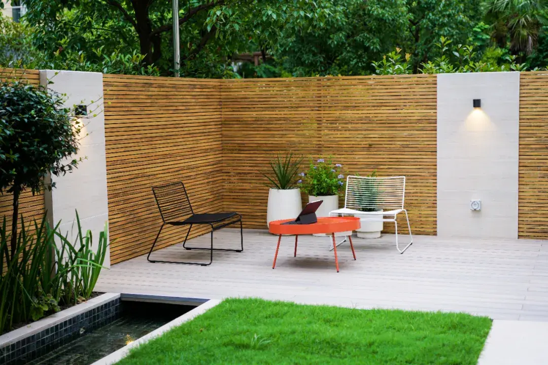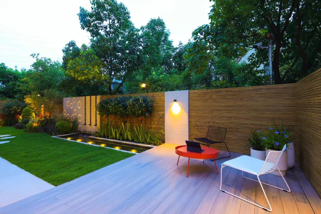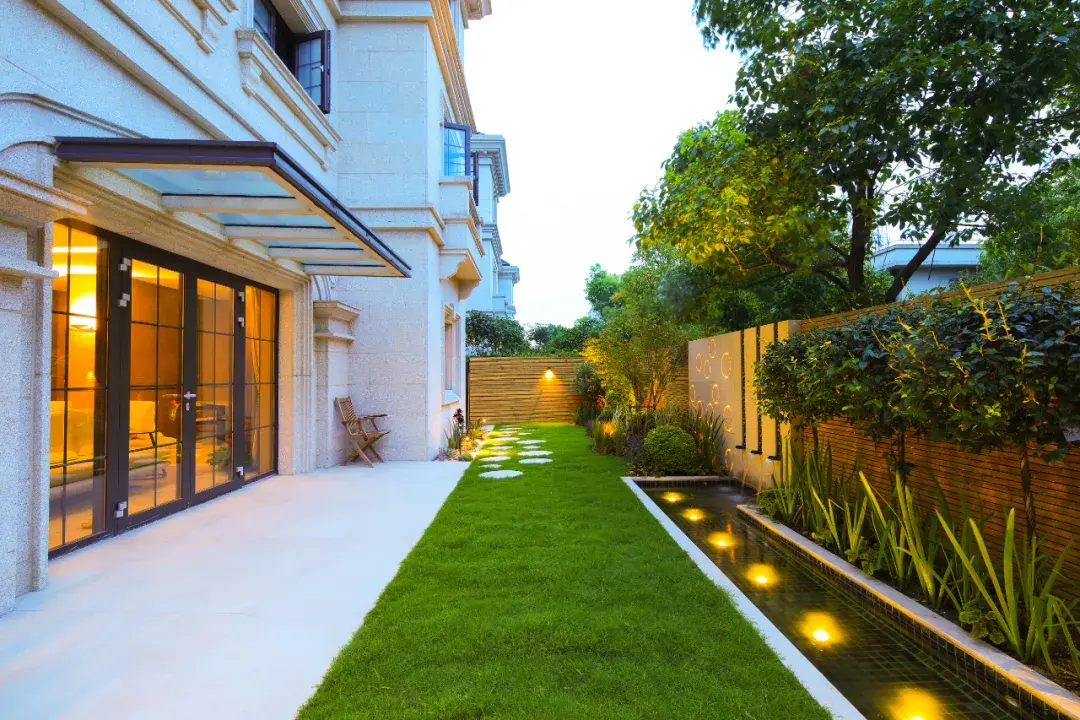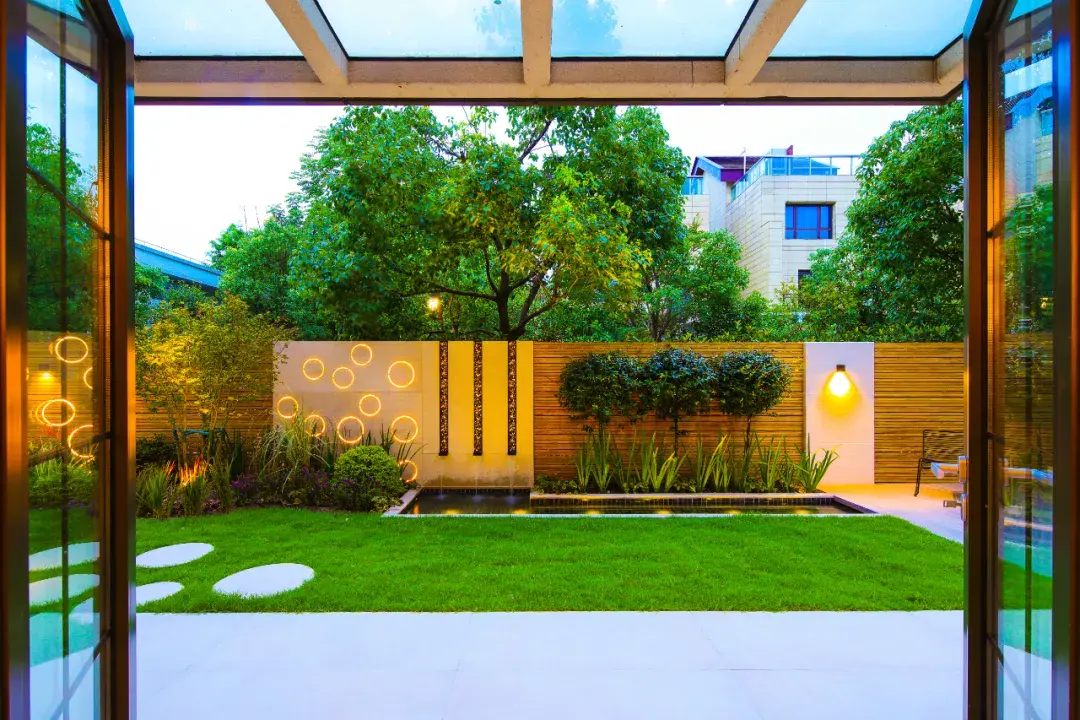 这里客厅门正对着的空间,在主空间的设计实现上,设计师为了最大程度的增大视觉空间,与室内产生联动, 在营造时大面积使用草坪,然后靠近围墙则特意创造了一个亲水空间,让这个区域成为了一个极简、生态、人性化的高品质生活空间。