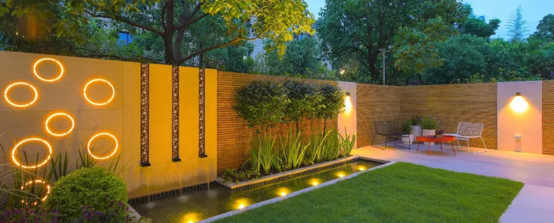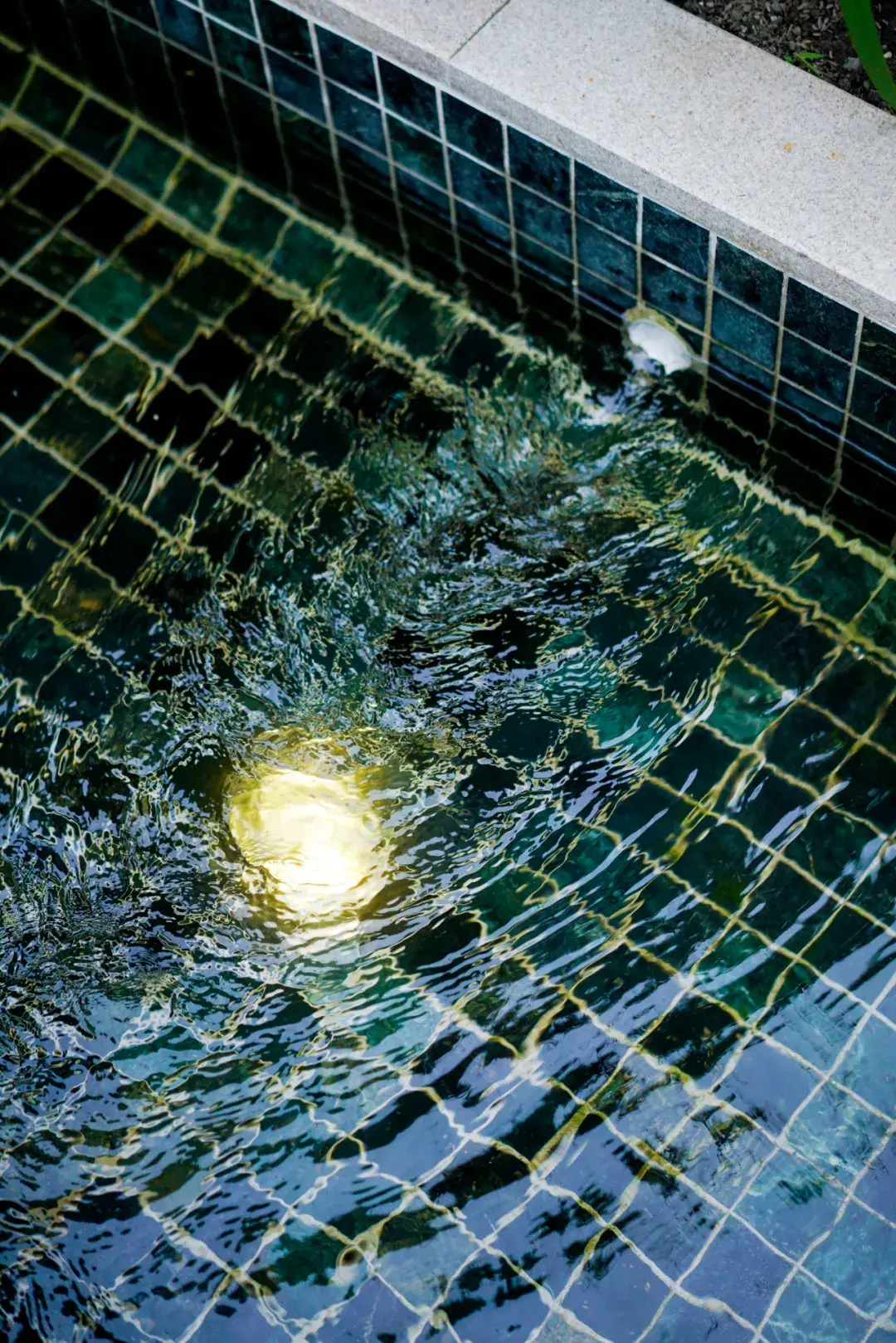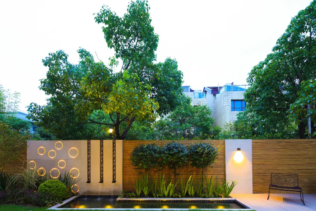 花园主空间的水景,亦是花园的主要观景区,方圆结合的流水景墙,搭配错落有致的植物,构筑出层次丰富的特色空间,让花园有了一种如痴如醉的美。