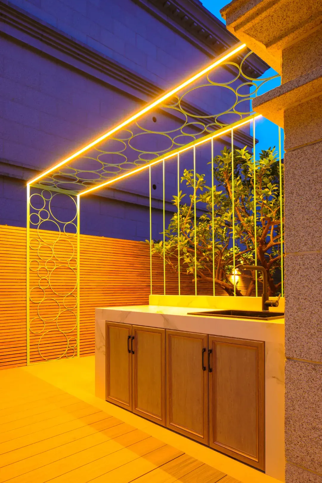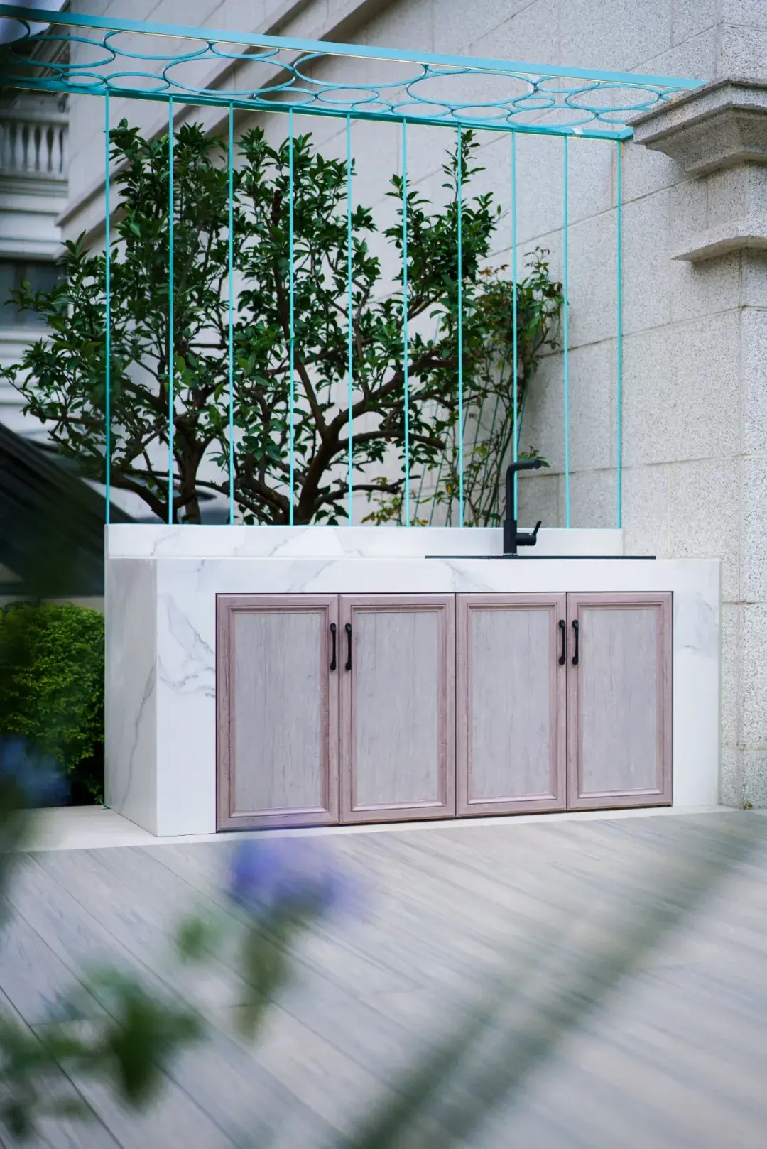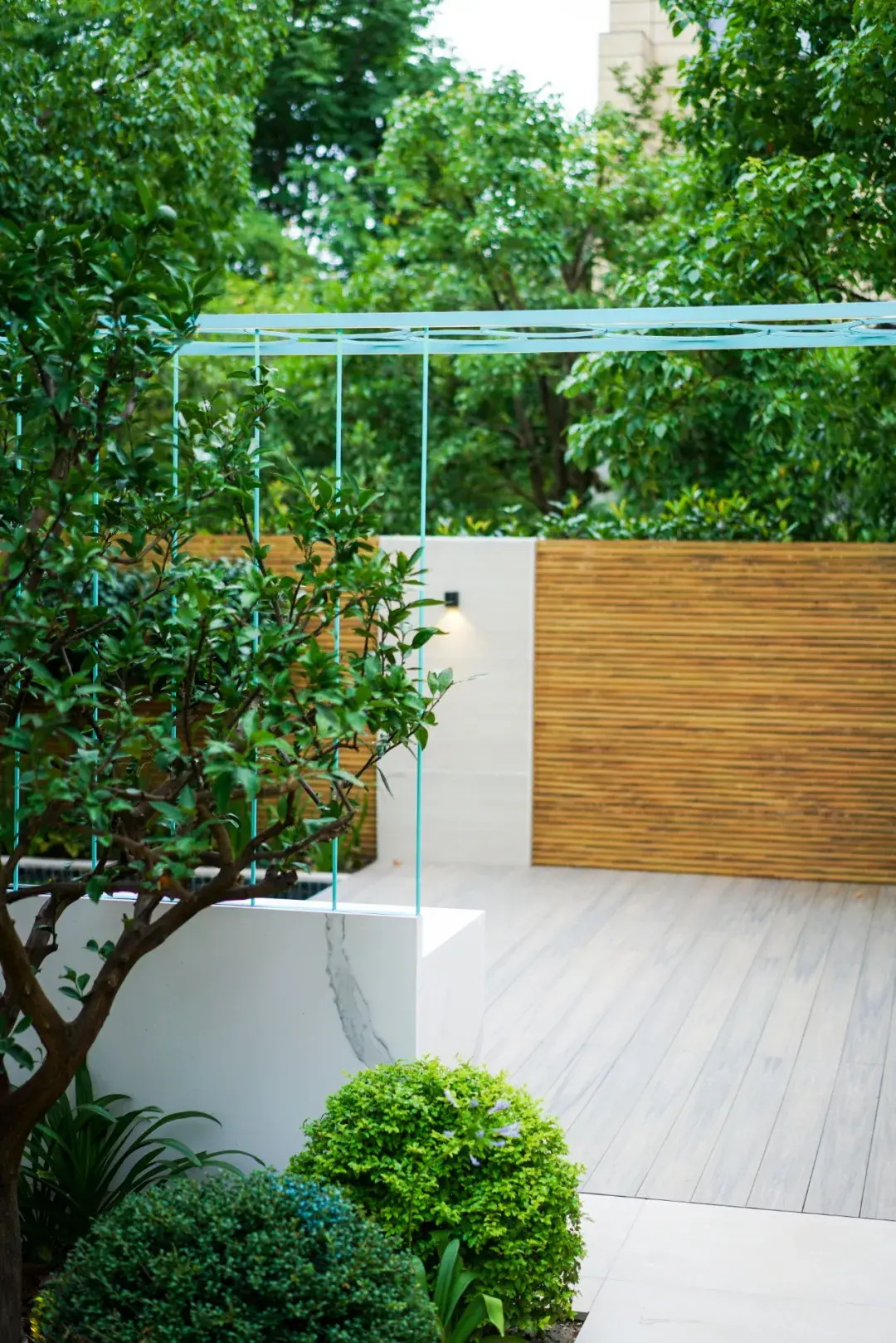 由于花园整体的形状呈呈“回”字型,于是设计师利用极简而美观的硬质铺装,链接起花园的植物、花架、主活动区、水景区、休闲区、操作台等区域,在保证不破坏花园现代简约风格的同时有景可赏。