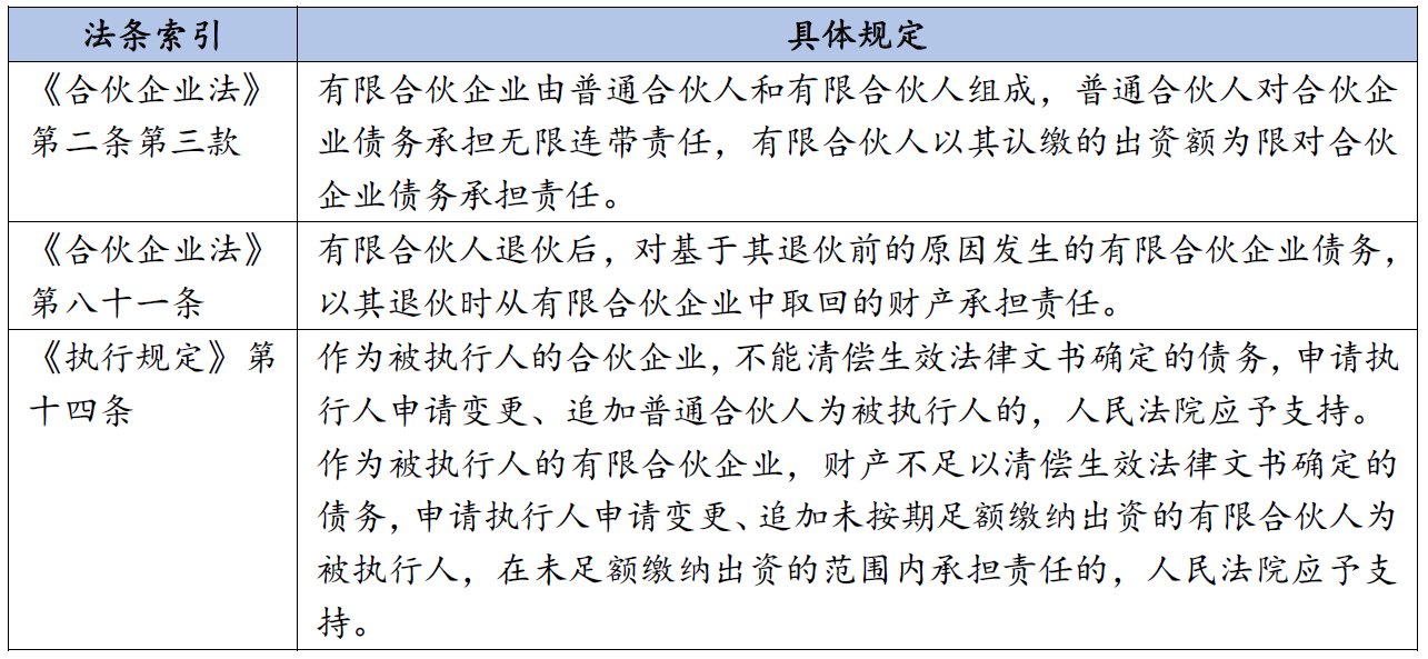 除了我们通常所知的有限合伙人以其出资额为限对合伙企业债务承担责任之外,与此问题有关的规定还包括:第一、《最高人民法院关于民事执行中变更、追加当事人若干问题的规定》(下称“《执行规定》”)第十四条第二款规定,当有限合伙企业财产不足以清偿债务时,未按期足额缴纳出资的有限合伙人有可能被追加为被执行人,需在未足额缴纳出资的范围内承担责任。第二、《中华人民共和国合伙企业法》(下称“《合伙企业法》”)第八十一条规定,有限合伙人退伙后,对基于其退伙前的原因发生的有限合伙企业债务,以其退伙时从有限合伙企业中取回的财产承担责任。