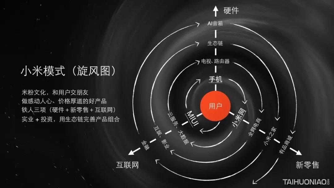 小米公司多位高管都曾解读过的“小米模式旋风图”,即以动态旋转式发展路径,把小米商业建构过程清晰呈现为这种逻辑递进关系:围绕“用户”自然生成,由创始时的MIUI旋转推进,经互联网、硬件、新零售3个方向定位,形成4个圈层的商业架构。