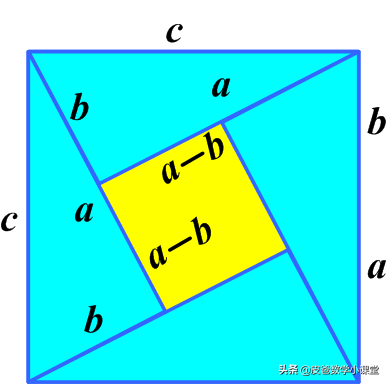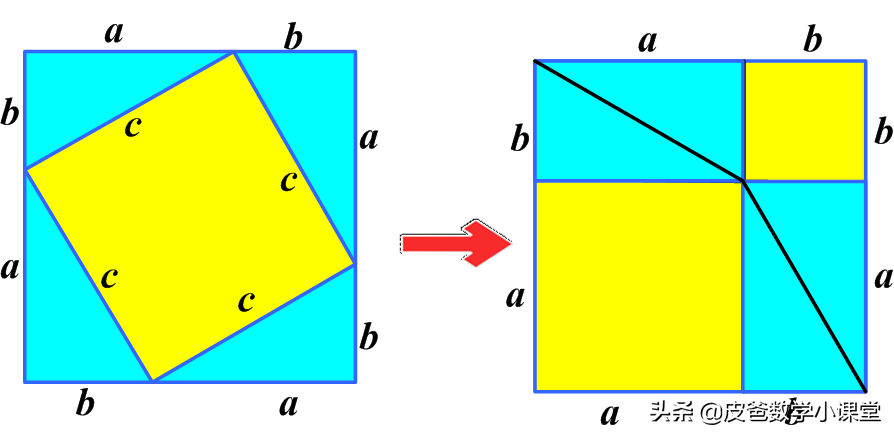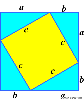 把图1中的三角形按照图2的方式重新排列,在图1中,黄色区域就是c平方,右边的图中没有被三角形覆盖的黄色区域面积为a的平方加b的平方,因此就有了