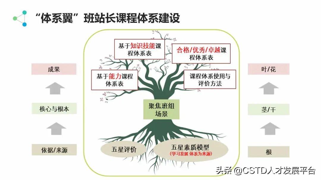 依据场景化聚焦实际业务工作的设计理念,项目将班组标准化建设、学习发展体系及其延伸——五星素质模型作为课程体系建设根本(即大树的“根”),聚焦班组关键场景(即大树的“干”),完成基于五星评价与五星素质模型的课程体系建设与完善工作,明确课程体系使用办法与班站长人才评价办法(即大树的“叶/花”),促进培训与评价的有效联动,提高人才培养价值。