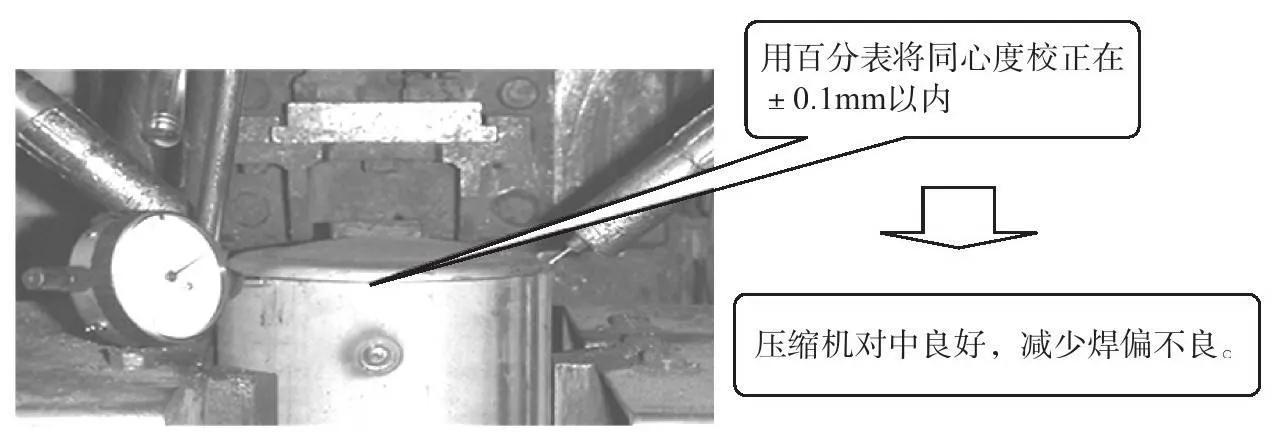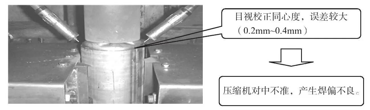 用目视与百分表校正同心度两种方法进行对比试验,目视校正误差较大,焊偏不良产生。