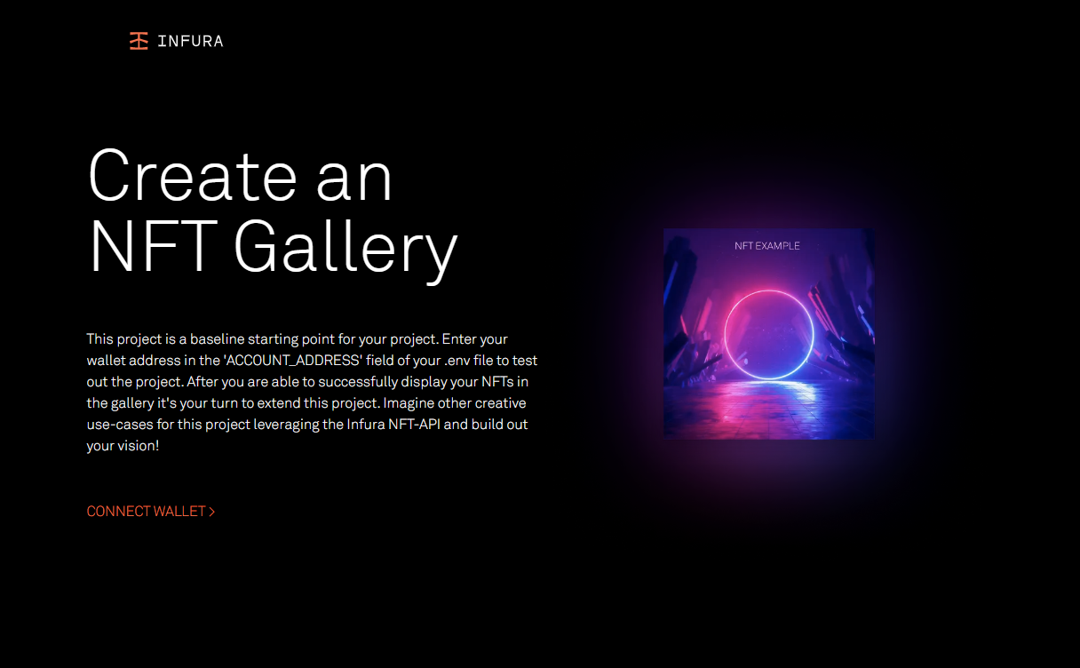 与 NFT API 一起,Infura 在他们的 Github 上发布了一个 NFT Gallery 项目来演示它的功能。我所要做的就是输入一个 Infura 项目 ID 和机密,然后将我的 MetaMask 钱包连接到 dApp 前端。然后 dApp 使用 API 获取所有 NFT,以便在前端很好地显示。因此,为了分解这个问题,我需要这个项目的以下内容: