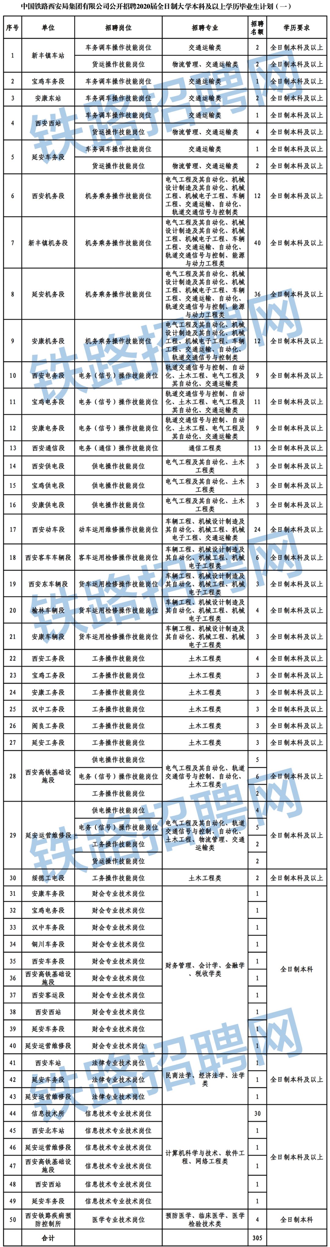 中国铁路西安局集团有限公司根据人才需求,拟采取校园招聘方式招聘全日制大学本科及以上学历高校毕业生305人。有关事宜公告如下: