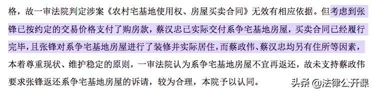 法院着重查明,宅基地使用权人父子二人,父亲经村委调解,另建造房屋居住,儿子常年在贵州生活,已购房,而买方对系争宅基地房屋已经装修入住,所以腾退房子不利于社会稳定。