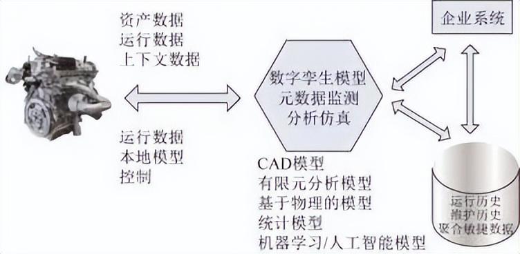 数字孪生正被用来优化有形资产、系统和制造流程的操作和维护[10],其中,物理对象可以虚拟地与其他机器和人互动[11]。数字孪生已用于如发电涡轮机、喷气发动机和机车的设备维护。其他的案例包括使用3D建模为物理对象创建“数字伙伴”[12],可以用来查看真实物理对象的状态,为将物理对象投射至数字世界提供方法[13]。例如,当传感器从连接的设备收集数据时,传感器数据可用于实时更新设备状态的“数字孪生”副本。