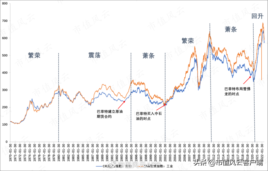 国际油价的启动时间与此同步,不再赘述。就在2020年,巴菲特抄底雪佛龙并一路将其买成十大重仓股之一。这个阶段,又恰好与国际大宗商品的牛熊转换相契合。