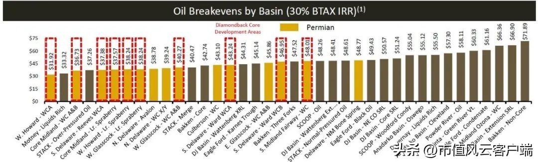风云君在此前的文章中介绍过,以美国二叠纪盆地核心产油层为例,页岩油生产商的盈亏平衡油价在40美元/桶附近,有些甚至更低。