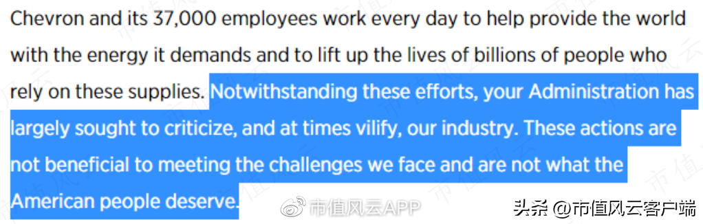 对此,雪佛龙CEO沃斯写信回怼拜登,称解决美国国内油价上涨需要深谋远虑的行动与合作的意愿,而不是政治言论。并表示拜登试图甩锅通胀问题甚至抵毁美国石油行业的言论,无益于矛盾的解决。