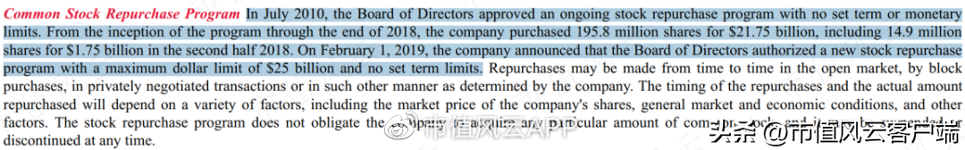 2019年2月1日,雪佛龙宣布了一项新的股票回购计划,最高回购金额为250亿美元,没有设定期限限制。