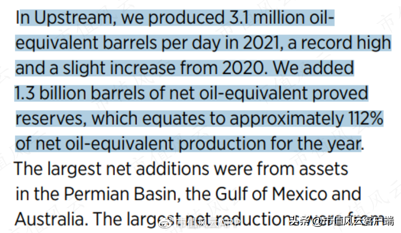 2021年,雪佛龙每日石油产量达到310万桶当量(Boe,注:文中如无特别说明,则桶=桶当量),创出历史新高。与此同时,新探明原油储量13亿桶,相当于当年石油总产量的112%。