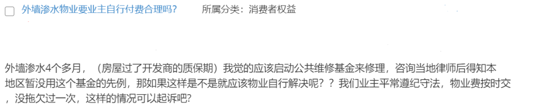 房屋的外墙渗水4个多月,虽然房屋过了开发商的质保期,但是我觉得应该启动公共维修基金来修理。我咨询了当地律师后,得知本地区暂时没有启用公共维修基金来修理的先例。那么如果确实如此,外墙渗水问题是不是就应该由物业自行解决呢?我们业主平常遵纪守法,按时交纳物业费,从未拖欠过一次,遇到这样的情况是否可以起诉?