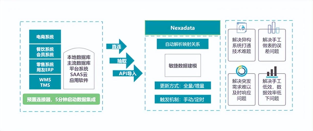 下秒数据Nexadata产品支持通过无代码的数据集成与数据建模技术,帮助企业将所有应用程序、数据库、事件和文件等数据信息提取到数据仓库中,并快速将分散的数据转化为数据集、API、自动化流程等开箱即用的数据服务,进而打破企业的数据孤岛问题。
