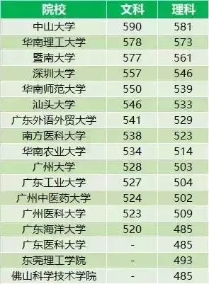 广东省2017年普通高校招生第一批本科院校录取最低控制分数线如下: