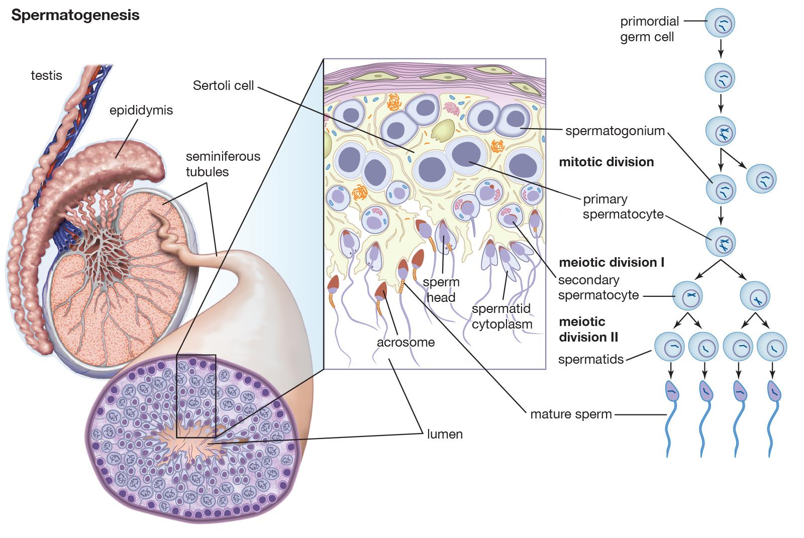 而产生小蝌蚪的场所就是睾丸,睾丸里面有很多的弯弯曲曲的曲细精管,其中就包含了大量的精原细胞,而精原细胞就是小蝌蚪的前身,也就是雄性的原始生殖细胞,当雄性动物性成熟时,这些精原细胞就会进行减数分裂,然后才能形成成熟的生殖细胞——精子。每毫升的精液中的精子数一般在6千万到2亿个。